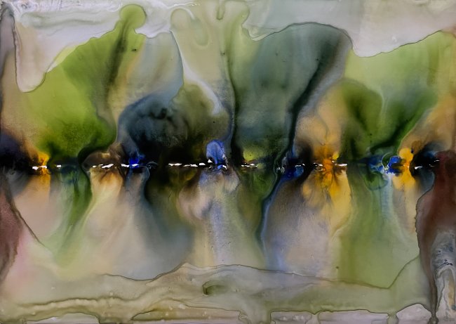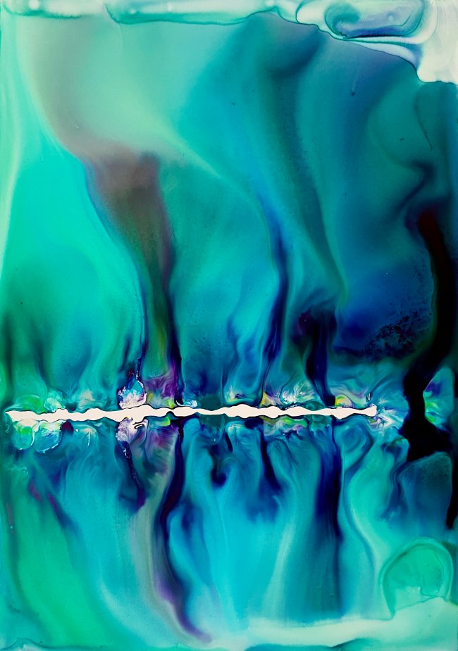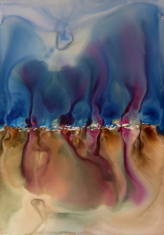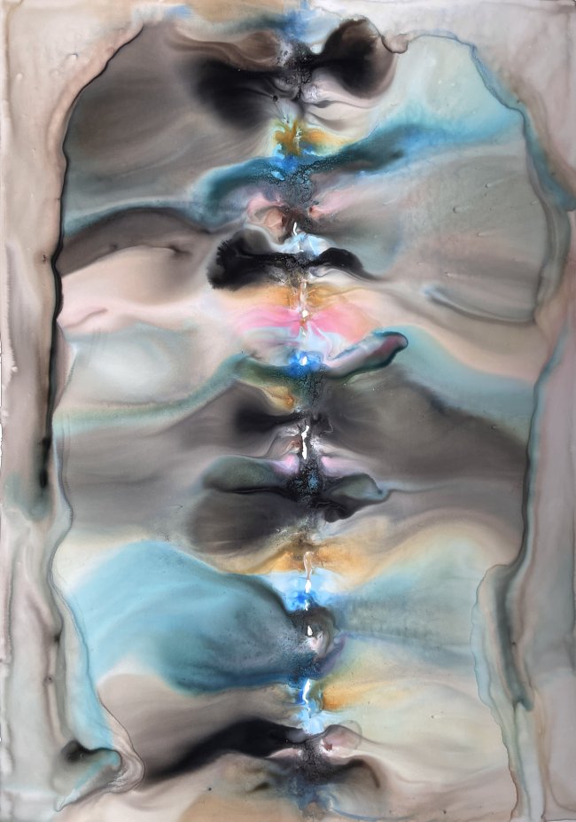 Milena Makani - Ondelis, 2025. Acrylic, watercolour and ink on mineral stone sheet — Image 25cm 9.8in, Sheet 35 x 28 cm 14 x 11 in